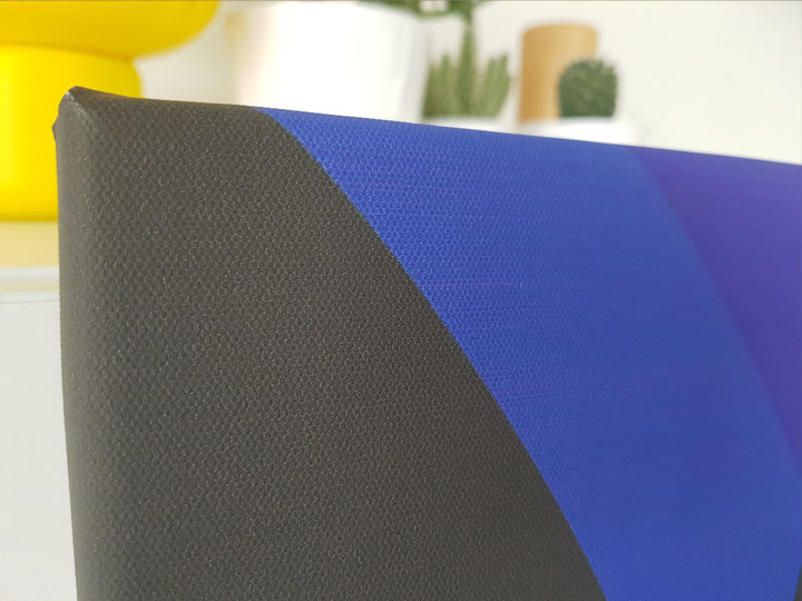 Het is een abstract kunstwerkje geworden met enkele opvallende kleuraccenten. De randen zijn netjes afgelijnd, zoals het hoort. Over de kwaliteit van het gedrukte doek valt dus niet te klagen.
