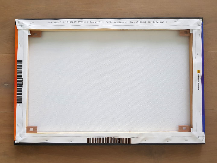 Het doek werd met enkele nietjes op het houten kader vastgemaakt. Erg handig zijn de openingen in de hoeken. Die maken het ophangen veel makkelijker (hoewel ik de canvas gewoon op een kastje tegen de muur zet).